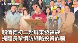 總統賴清德今天到高屏地區發福袋,並到屏東縣東港東隆宮參香祈福,除祝福大家新年發財,也提醒民眾留意防詐,尤其群組的投資詐騙.