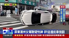 屏東女駕駛 駕車自撞前車,自翻90度 - 這技術,應該也要搭配車輛好吧。又不是說翻就翻。汽車很安全,有鈑金。只是翻車門打不開,駕駛座。 假日,高手上路。