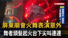 【民視即時新聞】屏東慈鳳宮昨天晚上舉辦大型的廟會活動,沒想到台上進行火舞表演時,舞棍上的火苗不慎掉到一名女舞者的頭上,她頭髮瞬間起火,嚇得台下民眾大叫 ...